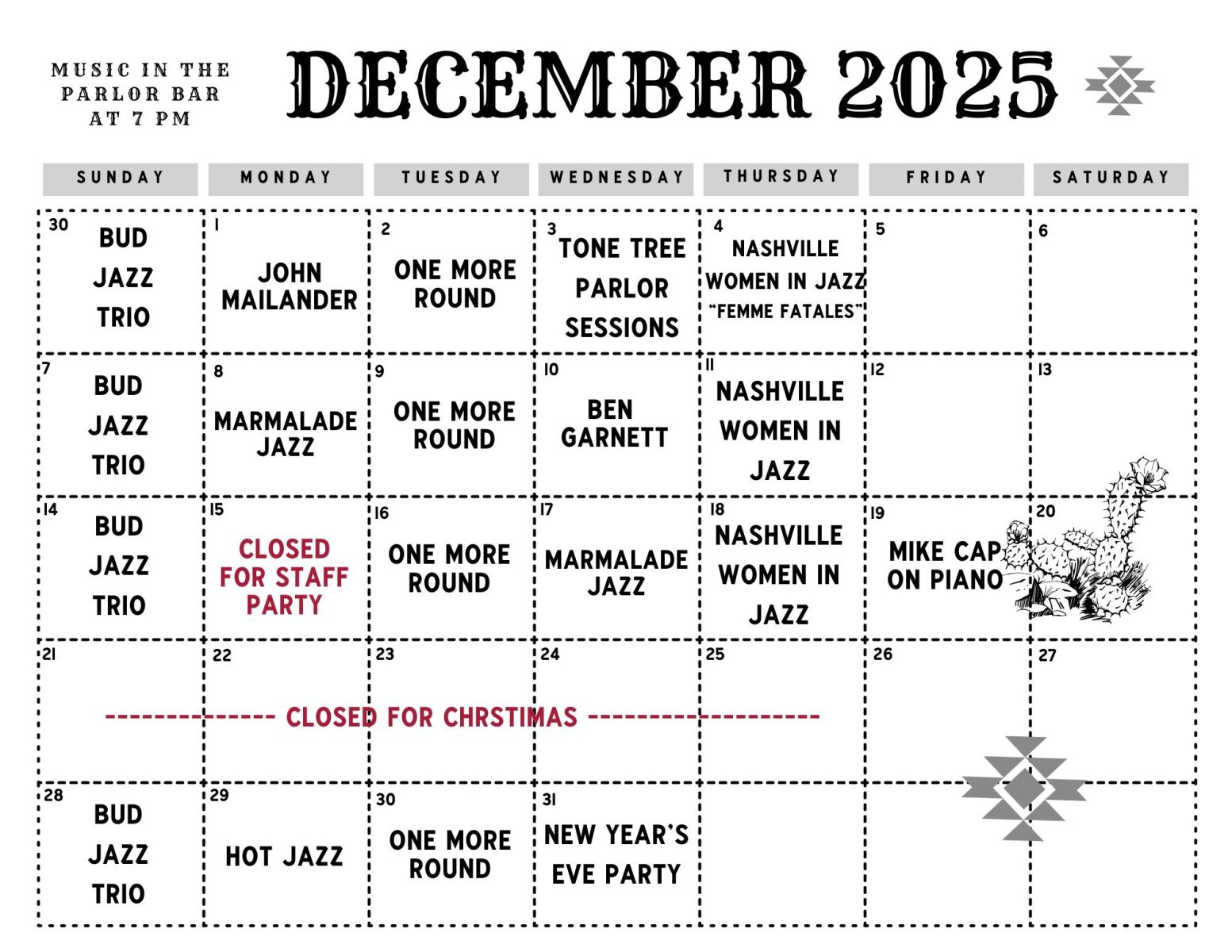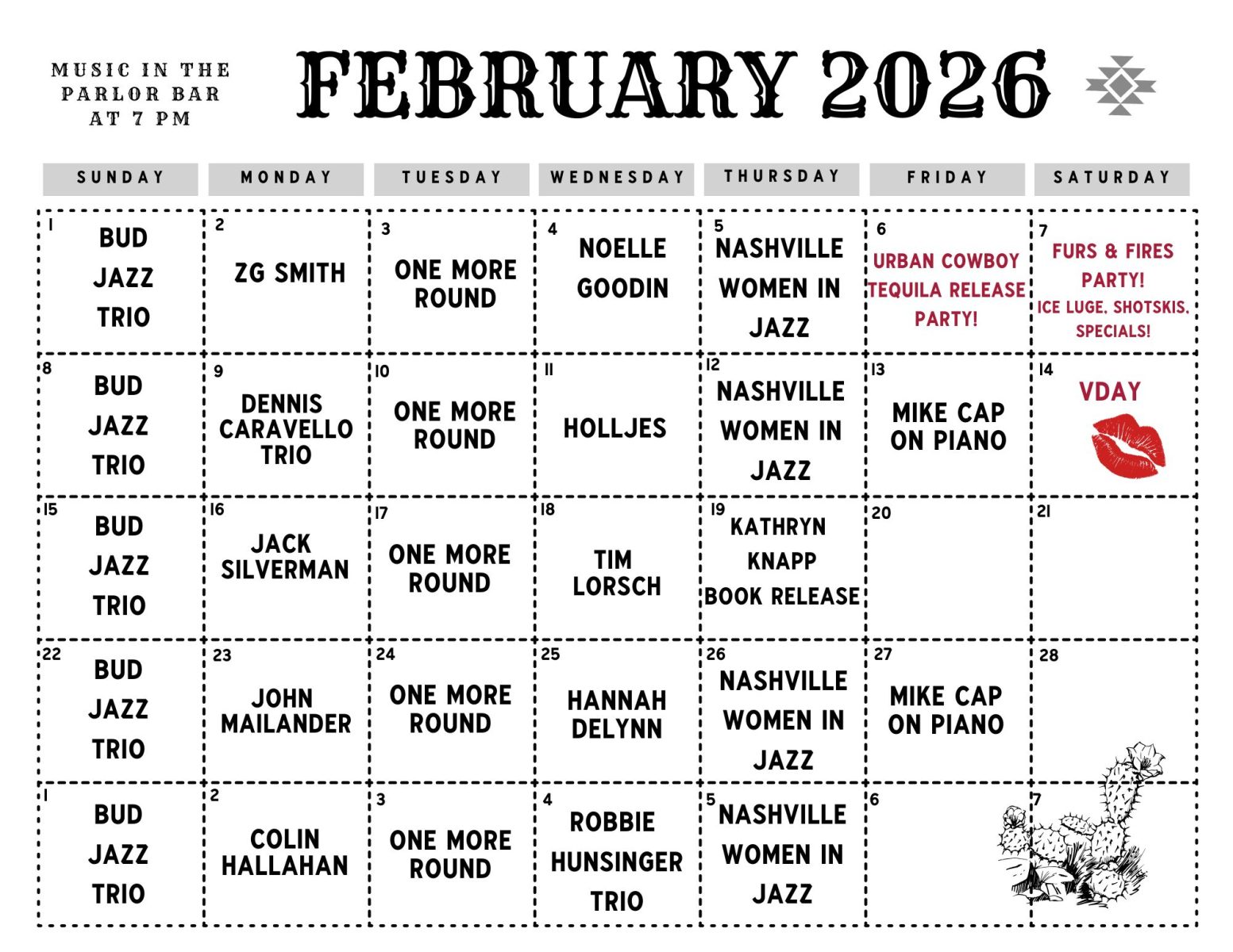Parlor Bar — Every day 4 pm – 10 pm; Music from 7 pm – 10 pm